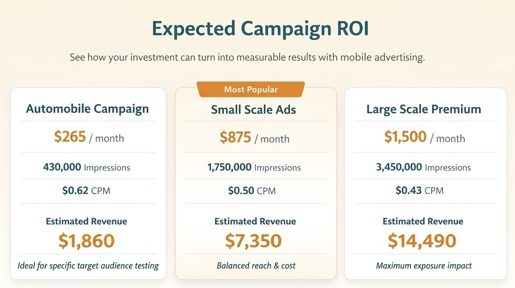 Mobile billboard advertising delivers significantly lower cost per impression than radio, TV, or print. You pay for continuous visibility without the recurring expenses of other media. Most clients see measurable results within the first few weeks of their campaign.
